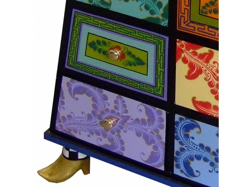 Diese schöne Designer-Kommode Jamaica aus Holz ist pyramidenförmig aufgebaut. Die Kommode hat zehn Schubladen in verschiedenen Größen und steht auf goldenen Pumps unter den schwarz-weiß karierten Socken. Der MDF-Schrank ist mit den bekannten Toms-Drag-Mustern farbig bemalt. Ein Prunkstück, entworfen von Tom Hoffmann (r.i.p.).