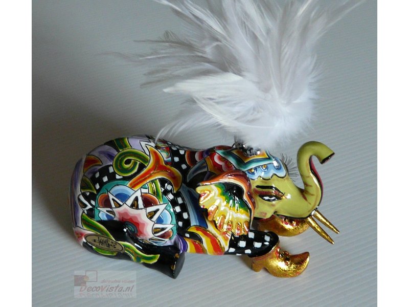 Dieser Elefant Soliman ist aus handbemaltem Marmorin gefertigt und misst 15 x 15 cm. Der Toms-Drags-Elefant ist einer der fünf kleineren Elefanten aus Tom Hoffmanns Tiersammlung, und die Figur hat schöne Details wie Wimpern, Ohrringe und eine weiße Federwedel.