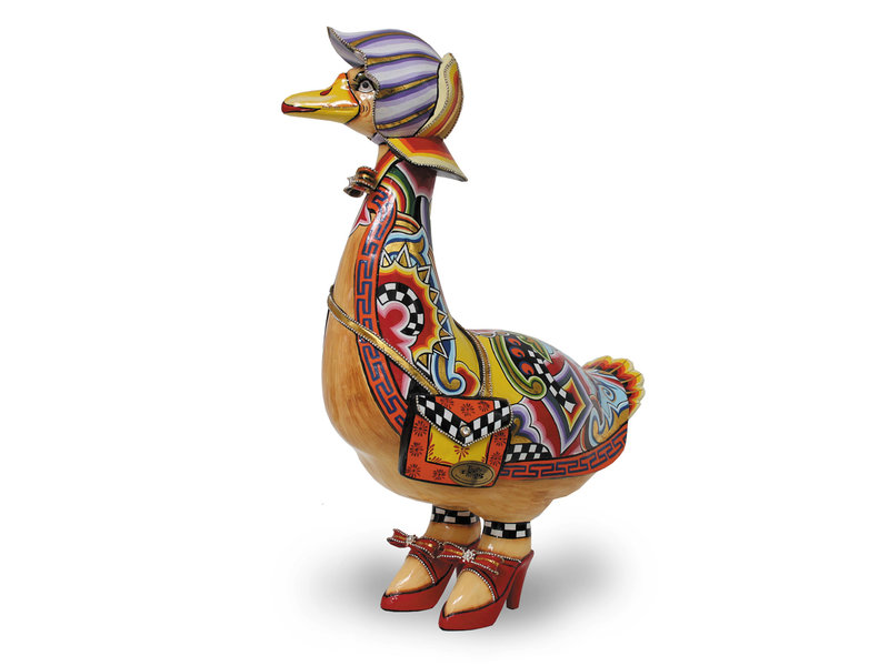 Gans "Amanda" XL. Der Designer wurde für diese Kreation inspiriert durch altbekannten Märchen. Amanda ist die "Frau" an Ganter Amadeos Seite. Stilsicher im Tom´s Drag Kostüm, Umhängetasche (nicht abnehmbar!) und roten Pumps. Grösse (BxH) 48 x 65 cm.
