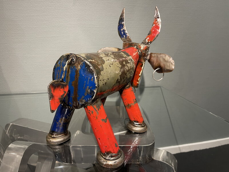 Unique metal bull, handmade from recycled barrels and metal parts. This contemporary design object can be perfectly combined with a retro and industrial interior.