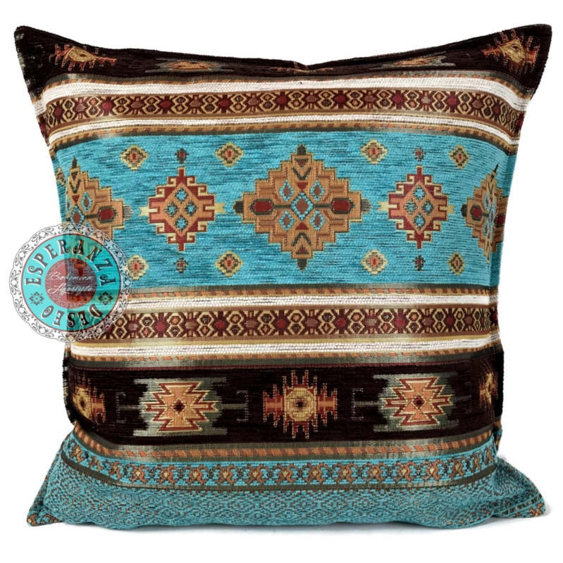 Handmade decorative cushion made of beautiful exclusive furniture fabric, combined with glossy fibres. A beautiful quality in Ibiza style or with an oriëntal look for a bohemian lifestyle. The decorative cushion has a black zipper, is colourfast and washable. Both sides are made of woven furniture fabric. So it is not an print.