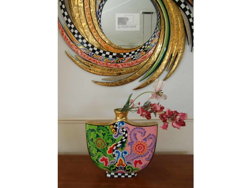 Ornate metal Toms Drags vase, flat model, only 8.5 cm deep. Great for on a mantelpiece, wall shelf or shallow cupboard. Width of the vase: 40 cm, height approx. 39 cm.
