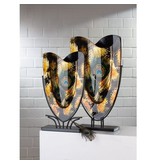 Stylish slim glass vase, hand-painted with a design of sparkling gold and brown and two blue-green peacock feathers. The glass vase has a lot of gold and perfectly fits the contemporary interior trend with warm chic accents. It is hand-painted and its undeep design makes it great for placement on a narrow windowsill or shelf. The glass vase is clamped into a black painted metal stand, from which it can be removed.