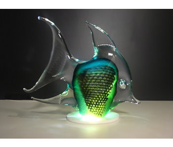 Pez luna grande con un dibujo cuadriculado de color verde oscuro en su interior. Dimensiones: H21 x L25 x D5 cm. El pez está hecho a mano con cristal de Bohemia de la República Checa de la más alta calidad y claridad. Peso aproximado de 1690 gramos.
