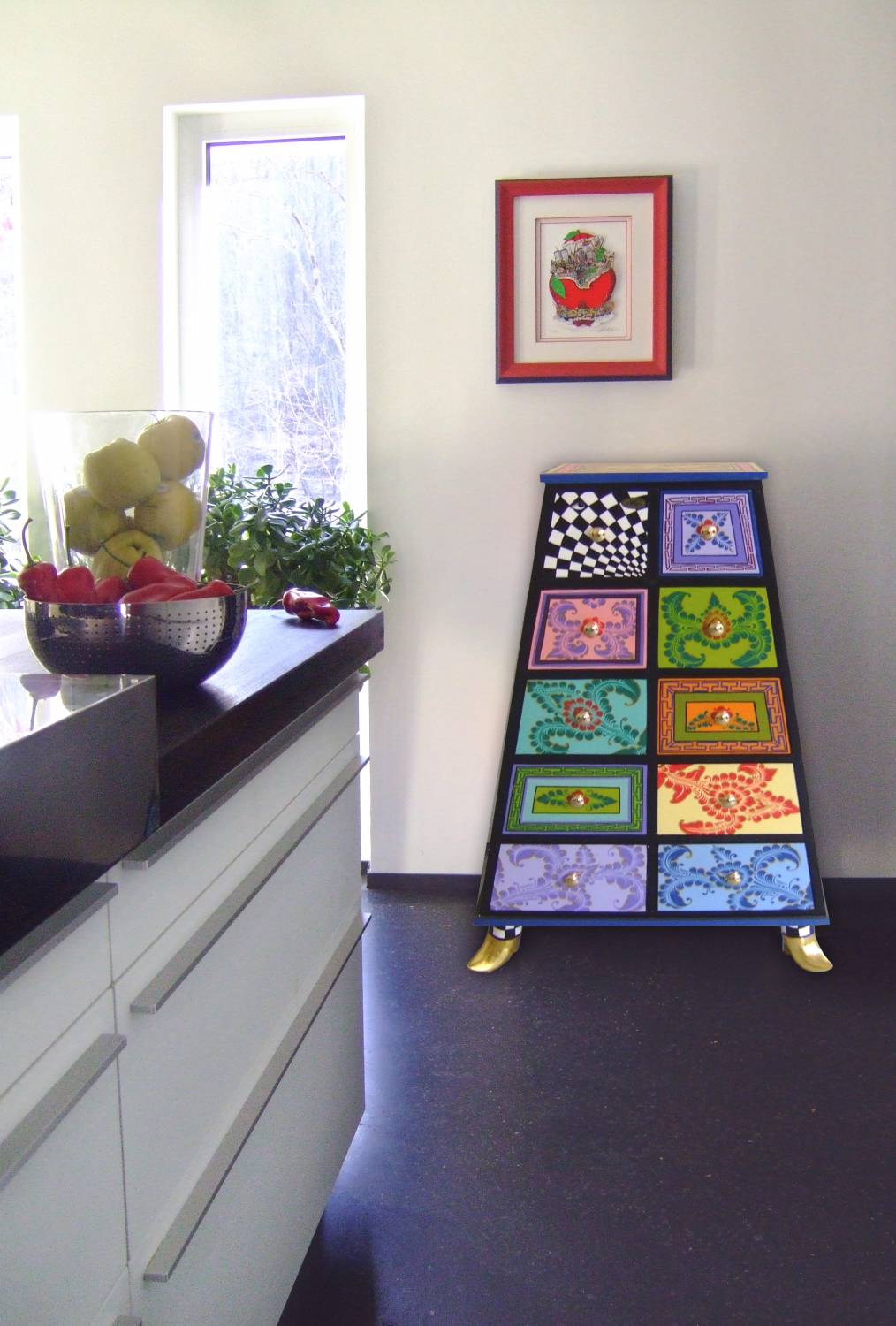 Si busca un armario inusual, encontrará un bello ejemplo con la cómoda Jamaica. Esta cómoda en forma de pirámide con zapatos dorados ha sido diseñada por Tom Hoffmann.