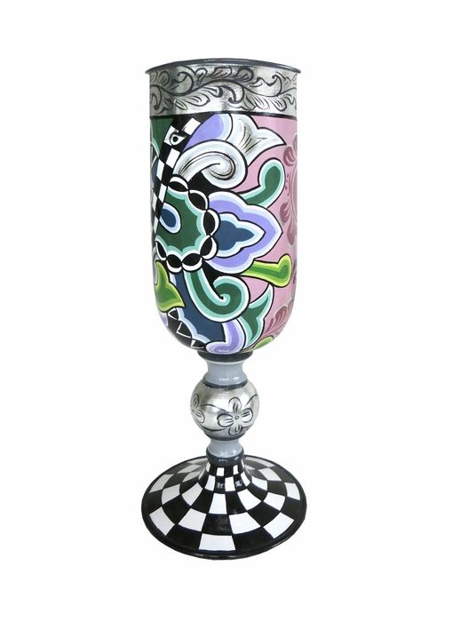 Cáliz sobre una base redonda de cuadros blancos y negros, altura 68 cm x Ø 24 cm. Este elegante jarrón de metal de Toms Drags está pintado con motivos en azul, verde, rojo y púrpura y completado con un amplio borde de plata. Consejo: