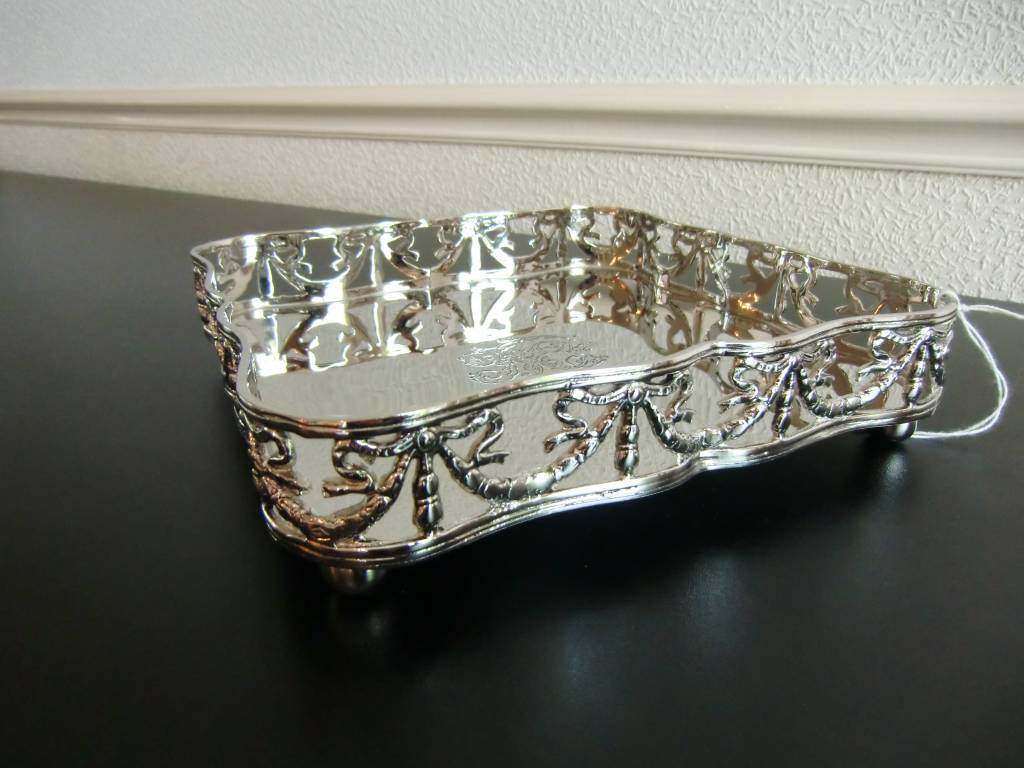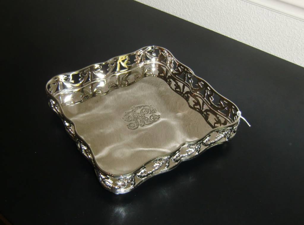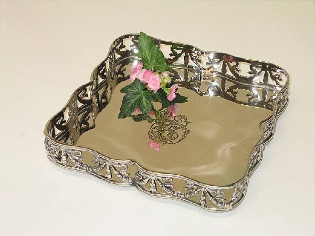 Romantisch, vierkant presenteerblad met afgeronde, gewelfde vormen en in het midden een wapen.Maat: 20cm x 20cm