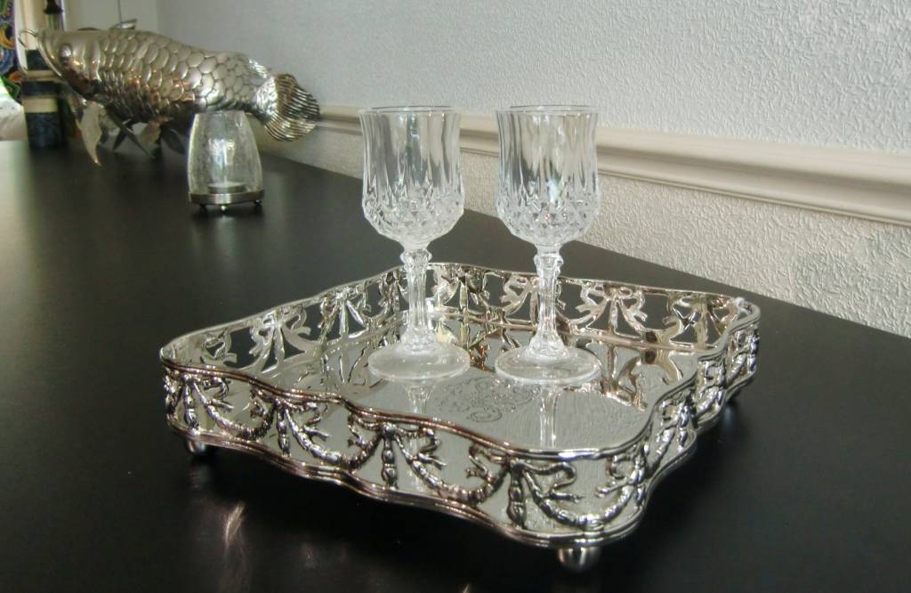 De zilvergekleurde metalen delen van deze fraaie producten uit de barokcollectie hebben een koper- of messingbasis, met daar overheen een laag van duurzaam nikkel. Hierdoor hebben en behouden zij de prachtige uitstraling van zilver, maar behoeven (en mogen) niet gepoetst te worden. Gebruik enkel een sopje en of een zachte doek om er lang plezier van te hebben.