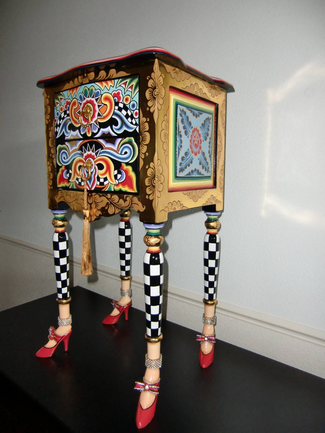 Prachtig Toms Drag ladenkastje of nachtkastje op rode hakken met een knipoog naar de Versailles stijl. Afm. H 70 x 39 x 31 cm. Handgemaakt van MDF, fleurig beschilderd en rijkelijk voorzien van bladgoud. Gratis geleverd in Nederland of afhalen.