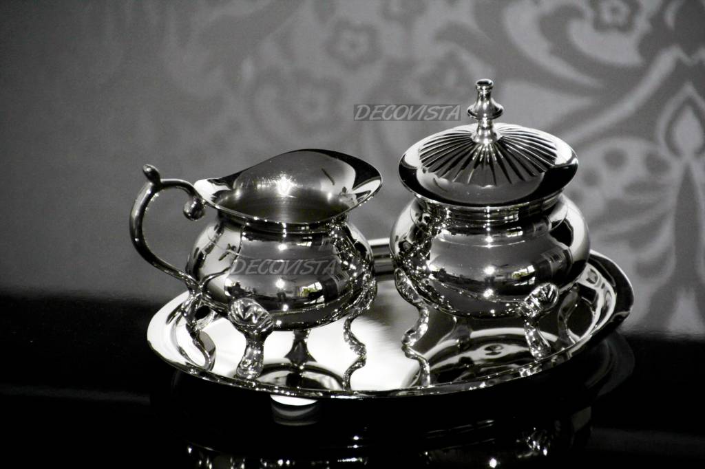 Chique roomstel in barok-stijl: een suikerpot, een melkkannetje en een  dienblaadje.