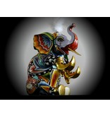 Prachtig handbeschilderd sculptuur van de zittende olifant Jumbo. De olifant is gedetailleerd door de designer vormgegeven en voorzien van met oogharen omkranste ogen, oorbellen en gouden slagtanden. De meegeleverde witte verentooi kan bovenop de kop van olifant Jumbo worden geplaatst. Natuurlijk ontbreken ook de gouden laarsjes en het echtheidslogo van Toms Drags niet.