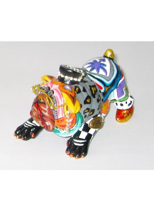 Klein schattig Toms Drag hondje, handgemaakt en handbeschilderd. Het hondje heet Little Mr. Barcley en is ontworpen door Tom Hoffmann. Gemaakt van resin. Lengte 14 cm.